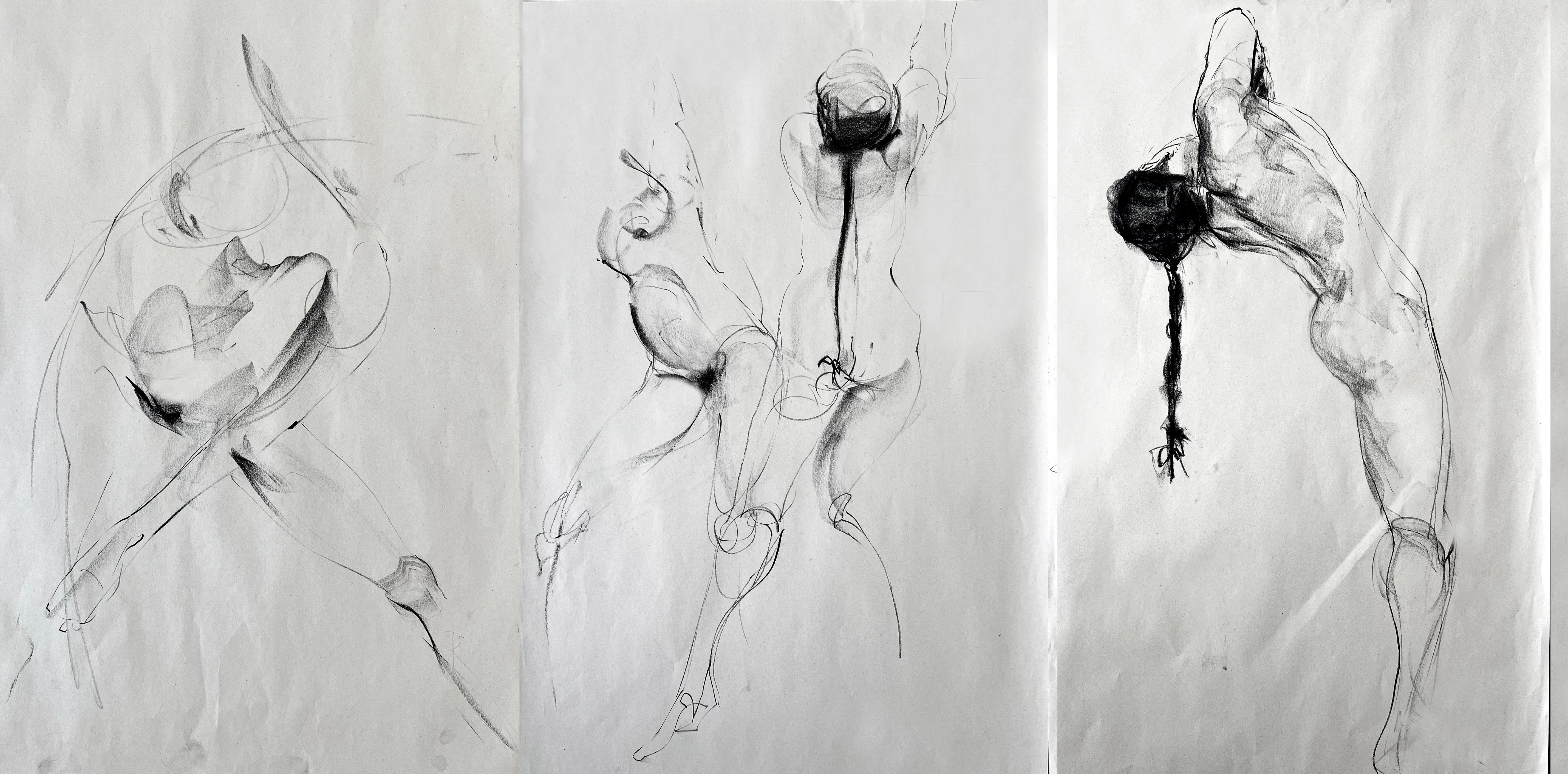 To make a gesture drawing, the steps required are: follow what you see as movement through the form; try to put on to the page your idea of the pose as a whole, or your idea of what the feeling is in the pose; and be spontaneous: get the marks down quickly, before you have time to alter, change or make judgments about them. What you end up with might be a bunch of lines and marks that don’t necessarily match the anatomical points of the body, and because you draw directly and fast, it might look like you are drawing “messy” or in a meaningless way. But the result is a drawing that is not universal, neither is it meaningless. It has a meaning because the lines and marks are direct expressions of how you interpret the pose.